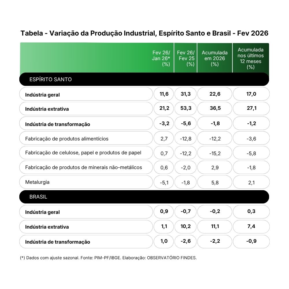 O principal destaque do desempenho industrial capixaba segue sendo a indústria extrativa, responsável por sustentar o crescimento do setor nos primeiros meses de 2026.