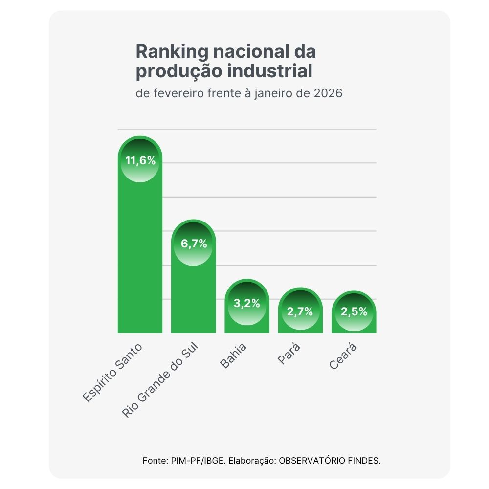 A indústria do Espírito Santo manteve o ritmo de crescimento de 2026 e voltou a se destacar no cenário nacional. Em fevereiro, a produção industrial capixaba avançou 11,6% na comparação com janeiro deste ano, registrando o maior crescimento do país nesse período. No acumulado dos dois primeiros meses de 2026, a indústria do Estado cresceu 22,6%, alcançando o segundo maior resultado do país, atrás apenas de Pernambuco (26,4%) e acima da média brasileira, que recuou 0,2% no período.