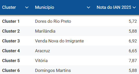 Os municípios de Dores do Rio Preto (Cluster 1), Marilândia (Cluster 2), Venda Nova do Imigrante (Cluster 3), Aracruz (Cluster 4), Vitória (Cluster 5) e Domingos Martins (Cluster 6) foram homenageados por conquistarem o primeiro lugar em cada cluster no IAN 2025. Enquanto Jaguaré (Cluster 1), Pinheiros (Cluster 2), Santa Teresa (Cluster 3), Jerônimo Monteiro (Cluster 4), Vila Velha (Cluster 5) e Mimoso do Sul (Cluster 6) foram homenageados por terem a melhor evolução do indicador entre 2019 e 2025.