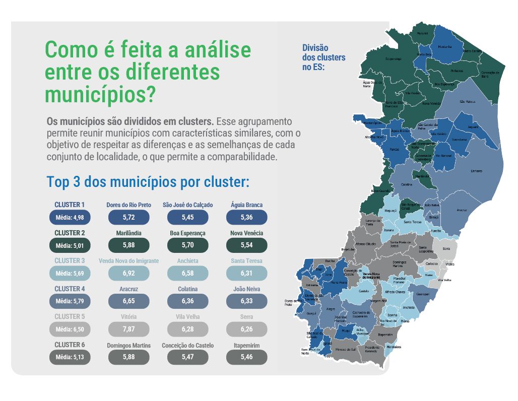 O IAN possui uma metodologia de agrupamento por similaridade, que consiste em reunir municípios com perfis semelhantes em termos de microrregião, população, Índice de Gini e Índice de Desenvolvimento Humano Municipal (IDHM), permitindo comparações mais adequadas entre realidades parecidas, ainda que estejam geograficamente distantes. Com isso, os 78 municípios capixabas são divididos em seis clusters.