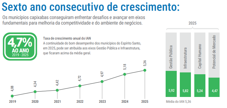 “Não se trata de um salto isolado. Estamos falando de uma construção coletiva, sustentada por planejamento, disciplina e compromisso com o cidadão. Quando isso acontece, o impacto aparece na ponta: processos mais ágeis, ambiente de negócios mais estável, e toda a sociedade sente o reflexo – do trabalhador que encontra oportunidade ao empreendedor que ganha condições reais para crescer. O IAN contribui na construção de políticas públicas que impulsionem o Espírito Santo inteiro”, comenta.