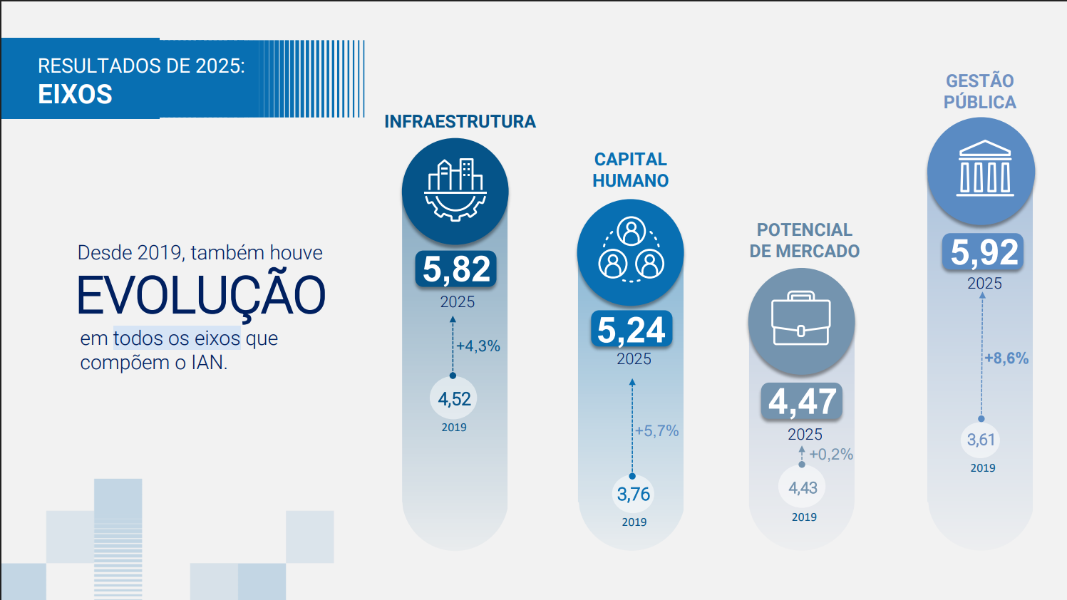 O IAN mostrou ainda que 11 das 12 áreas temáticas avaliadas nos últimos seis anos melhoraram, com avanços importantes em segurança pública, diversificação econômica, transporte e simplificação de processos burocráticos para quem quer abrir ou manter um negócio funcionando.