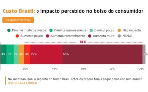 Ainda segundo a pesquisa, 81% dos industriais afirmam que o Custo Brasil eleva os preços finais ao consumidor. Desses, 55% acreditam que o aumento é muito significativo; 22%, razoável; e apenas 4% veem impacto pequeno.