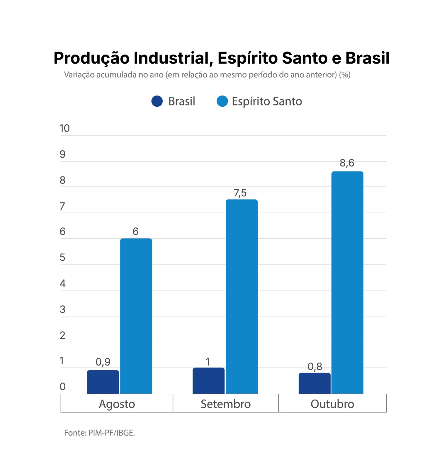 O Espírito Santo já liderava o crescimento industrial do país no acumulado de janeiro a agosto (6%) e manteve a primeira posição em janeiro a setembro de 2025 (7,5%), na comparação com o mesmo período de 2024. Além disso, a produção industrial capixaba segue acima da média nacional, reforçando sua posição de destaque no cenário industrial do país.