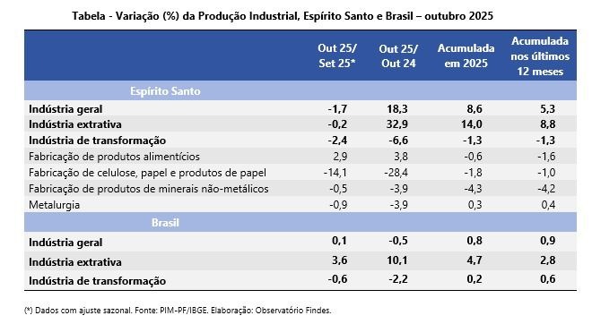 O desempenho capixaba se destaca mais uma vez na comparação interanual: em outubro de 2025, a produção industrial do ES cresceu 18,3% frente a outubro de 2024, registrando seis meses consecutivos de expansão com dois dígitos, o melhor resultado entre os estados pesquisados pelo IBGE.
