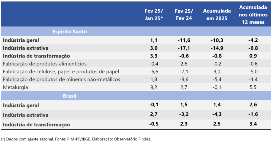 A economista-chefe da Findes e gerente executiva do Observatório Findes, Marília Silva, explica que o segmento de metalurgia teve bons resultados em três das quatro bases de comparação da pesquisa do IBGE. “Apenas no acumulado do ano (janeiro e fevereiro) observamos uma variação negativa de 0,1%. Já quando olhamos para o acumulado de 12 meses até fevereiro a alta foi de 5,5% e em fevereiro deste ano, na comparação com fevereiro do ano passado, ela foi de 2,7%.”