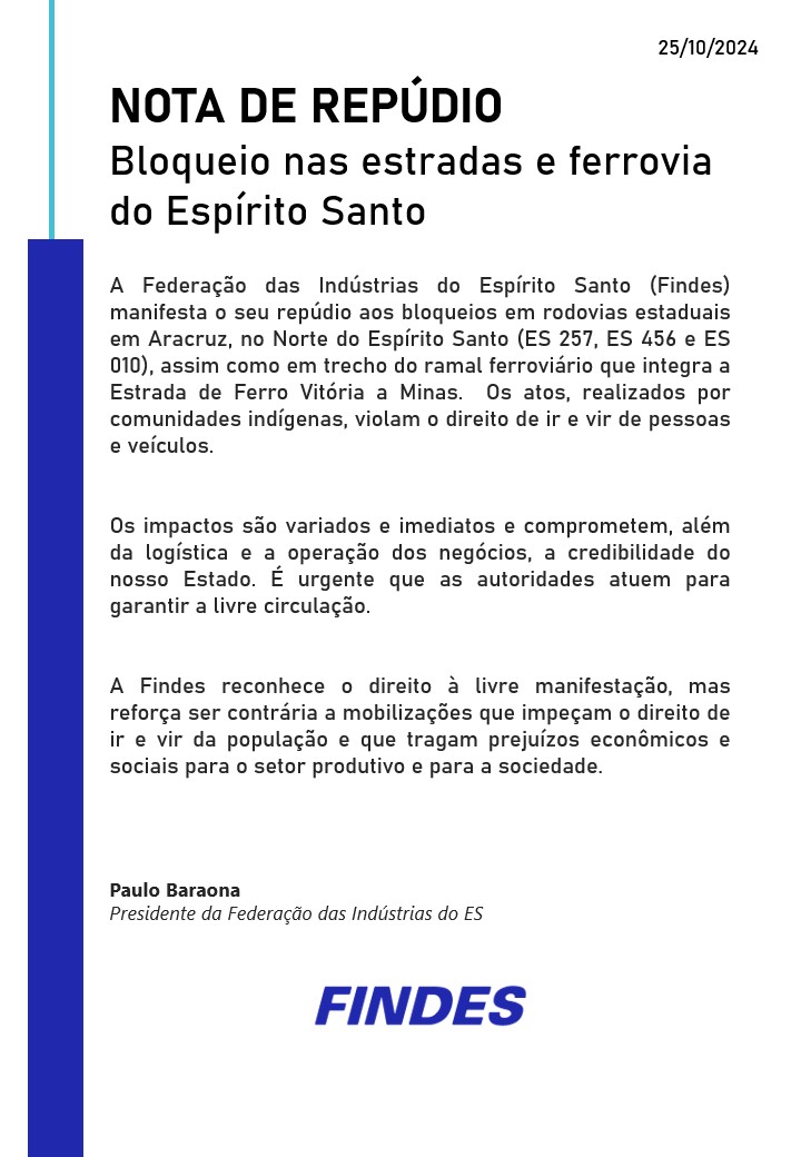 A Federação das Indústrias do Espírito Santo (Findes) manifestou o seu repúdio aos bloqueios em rodovias estaduais em Aracruz, no Norte do Espírito Santo (ES 257, ES 456 e ES 010), assim como em trecho do ramal ferroviário que integra a Estrada de Ferro Vitória a Minas.